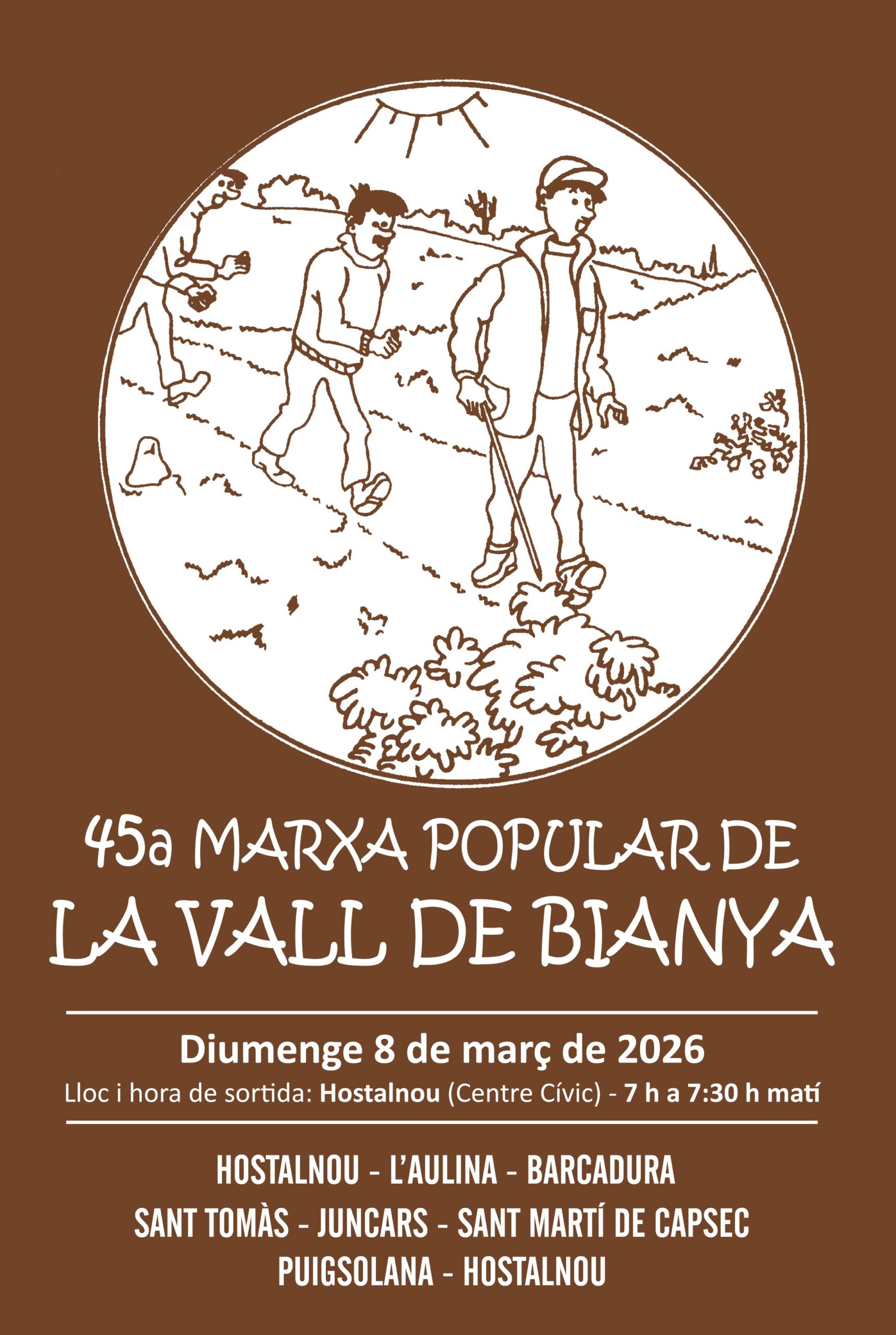 Agenda 45a Marxa Popular 08/03/2026 El proper diumenge 8 de març, es celebrarà la 45a edició de la Marxa Popular de la Vall de Bianya, amb sortida i arribada al nucli de l’Hostalnou, a les 7h. Descarrega el programa de la 45a edició, fent clic aquí. < Entrada Anterior