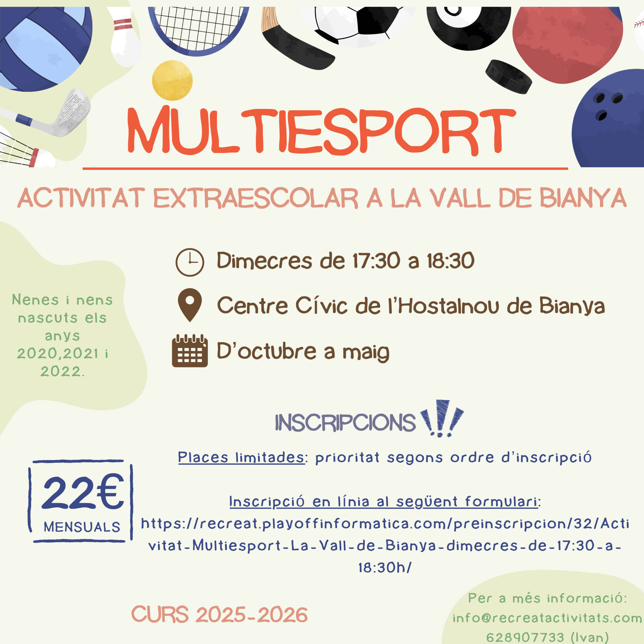 La Vall de Bianya organitza una activitat extraescolar de Multiesport, al Centre Cívic de l’Hostalnou, els dimecres de 17:30h a 18:30h, a partir del proper mes d’octubre, i s’allargarà fins al maig. Les places són limitades i podeu fer la vostra inscripció al següent link. Per més informació podeu contactar a info@recreatactivitats.com.