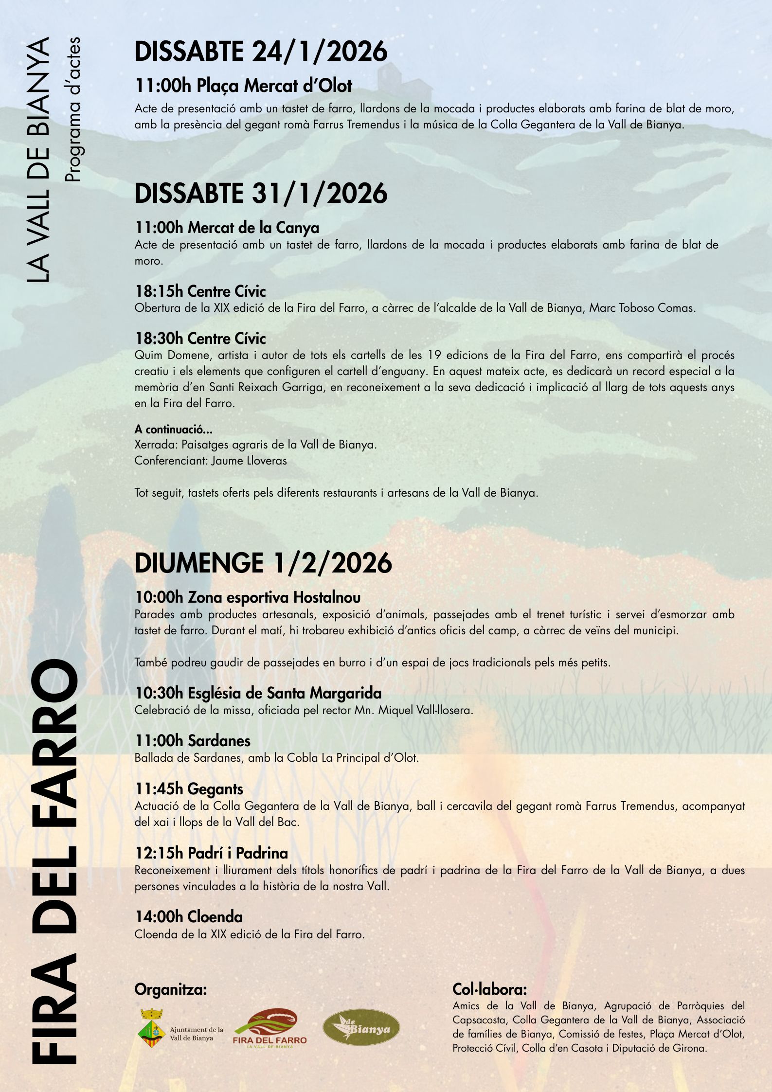 📍 Dissabte 31 de gener, al Centre Cívic, tindrà lloc la inauguració oficial, a càrrec de l’alcalde. Tot seguit es farà un record a Santi Reixach i als 19 anys de Fira, i posteriorment Jaume Lloveras oferirà una xerrada sobre el paisatge de la Vall de Bianya. La jornada clourà amb tastets gastronòmics elaborats per restaurants i artesans locals.