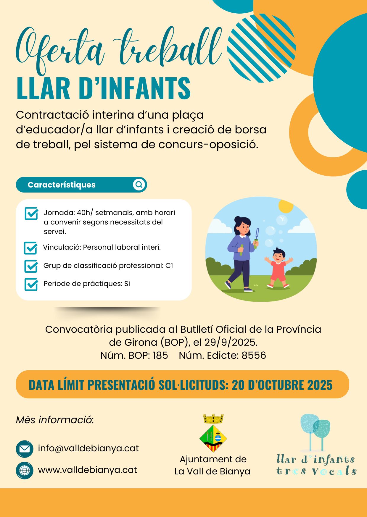 L’Ajuntament de la Vall de Bianya, ofereix la contractació interina d’una plaça d’educador/a a llar d’infants i creació de borsa de treball, pel sistema de concurs oposició. Convocatòria publicada al Butlletí Oficial de la Província de Girona (BOP), el 29/9/2025 amb el número de BOP 185 i número d’edicte 8556. Fes clic aquí per consulta […]
