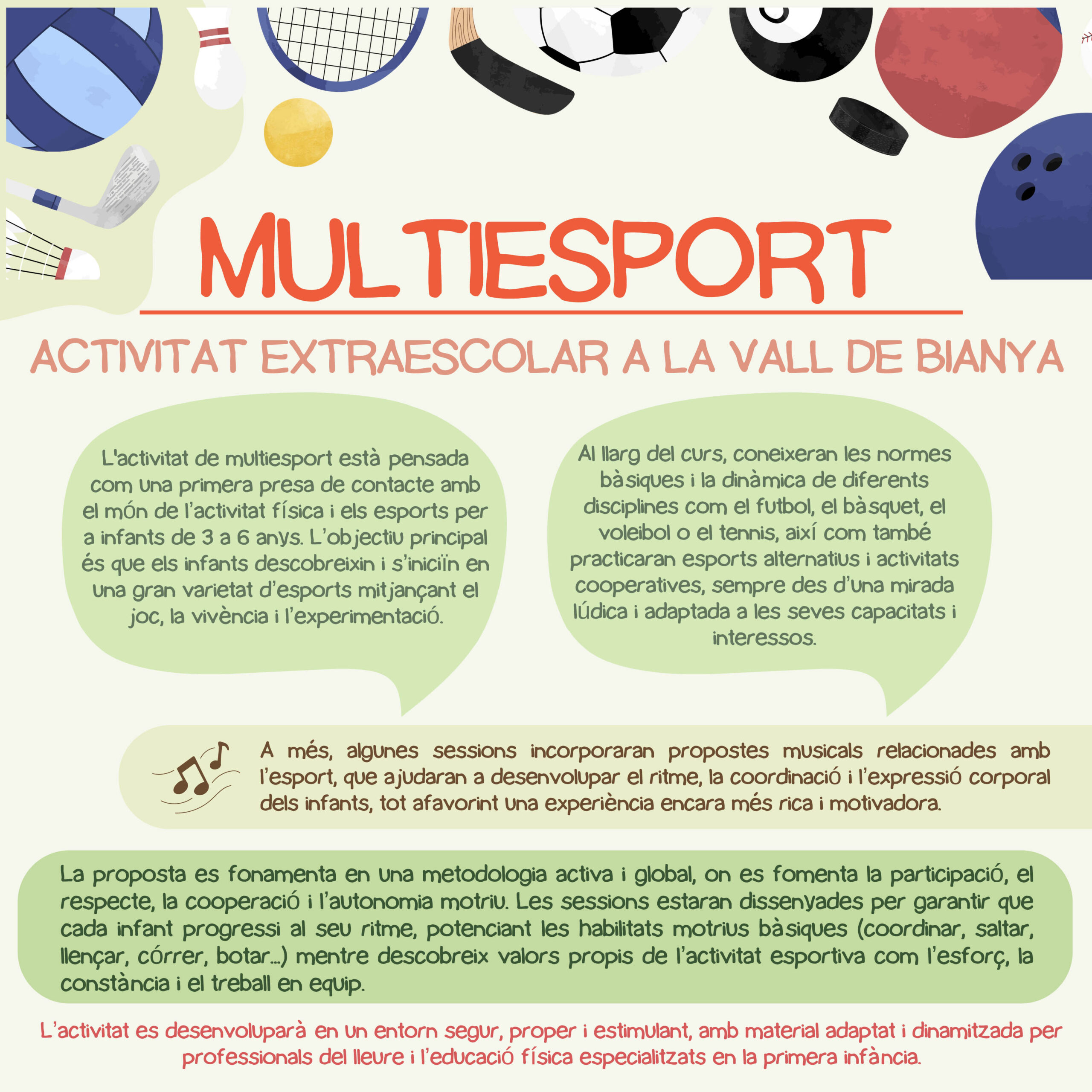 La Vall de Bianya organitza una activitat extraescolar de Multiesport, al Centre Cívic de l’Hostalnou, els dimecres de 17:30h a 18:30h, a partir del proper mes d’octubre, i s’allargarà fins al maig.