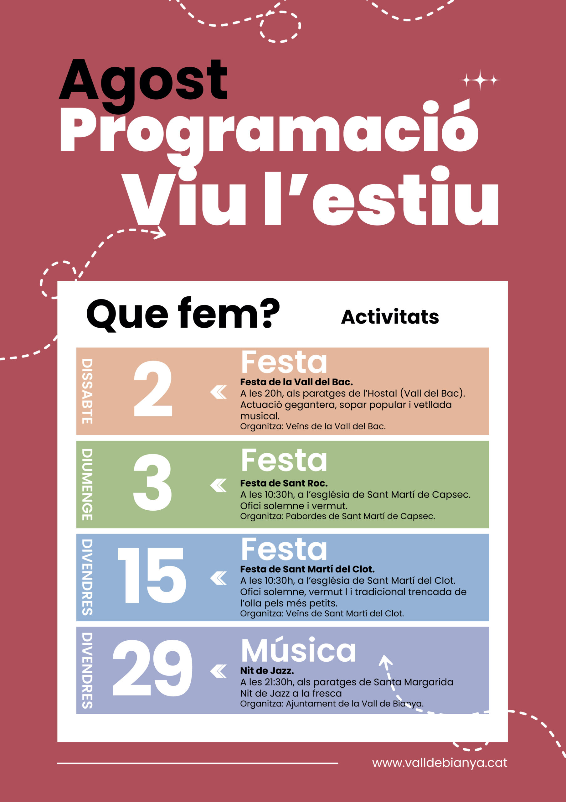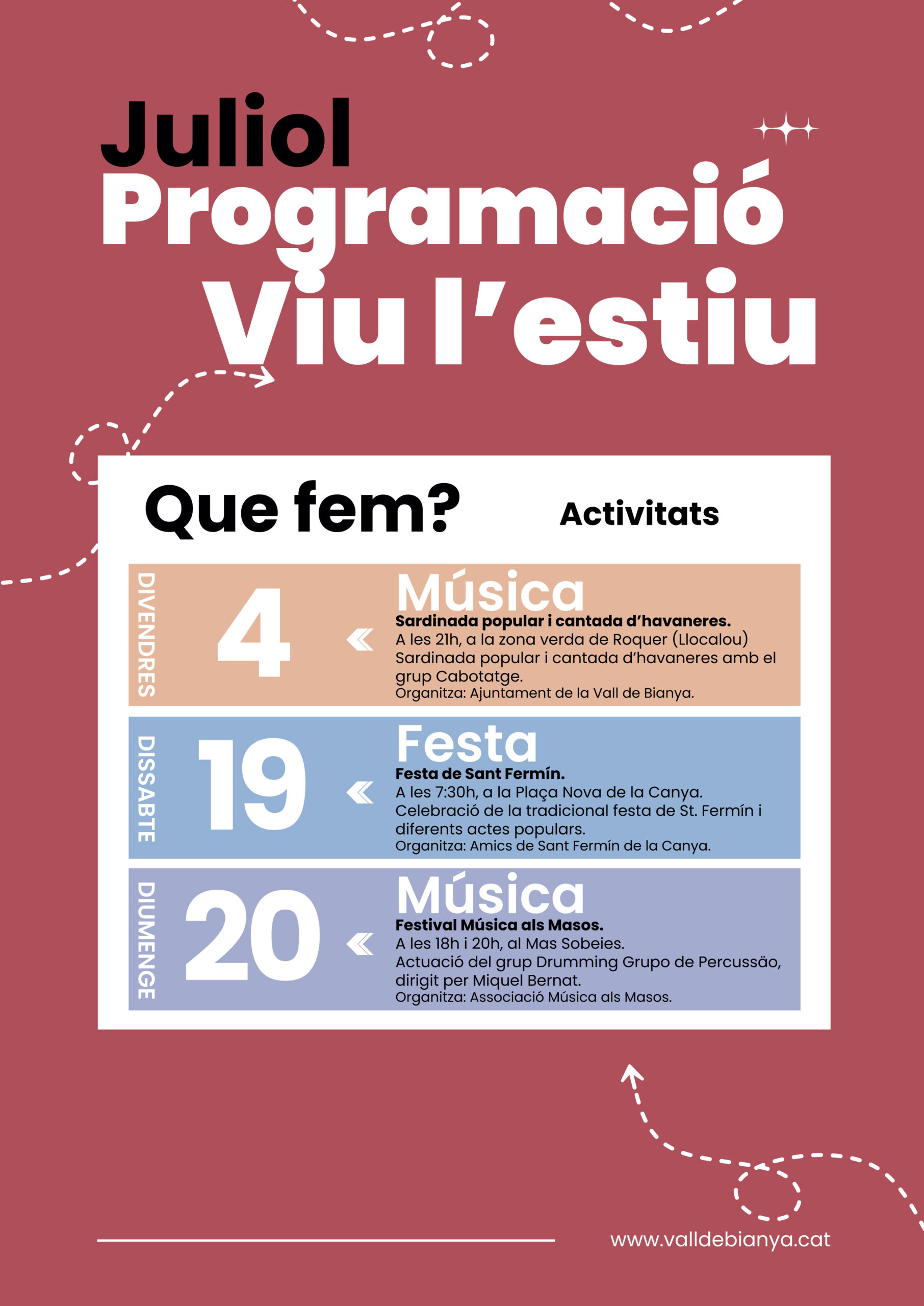 El calendari inclou propostes culturals, musicals i tradicionals, com la festa del segar i el batre, la nit de Jazz als paratges de Santa Margarida o la sardinada popular i havaneres a Llocalou. També es recupera la participació al festival de Música als Masos o la fantàstica festa que organitzen els Amics de Sant Fermín de la Canya.