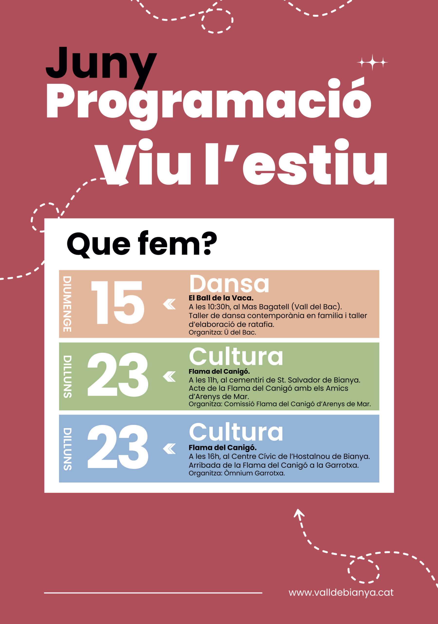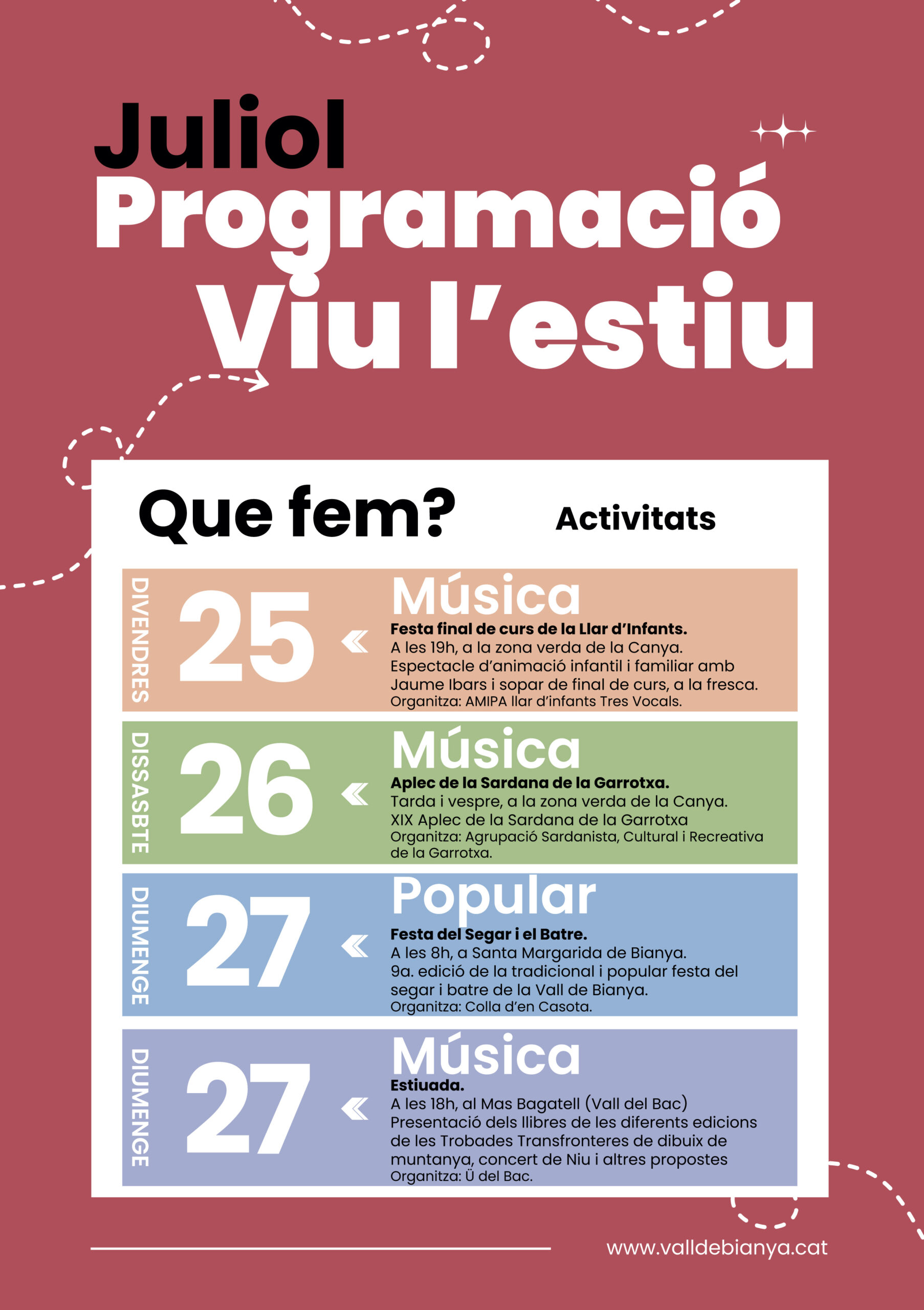 Amb l’arribada de l’estiu, l’Ajuntament de la Vall de Bianya ha presentat avui el seu programa d’activitats per als mesos de juny, juliol i agost, amb una oferta variada pensada per dinamitzar el municipi i fer gaudir tant a veïns com a visitants.