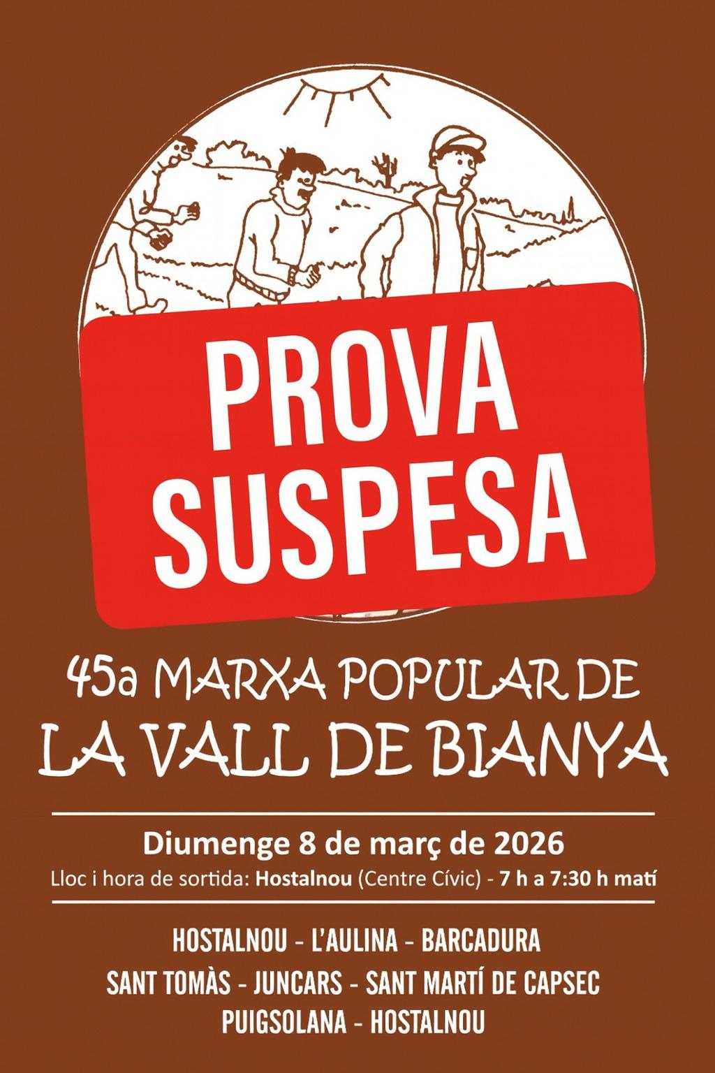 Aquest diumenge s’havia de celebrar la 45a edició de la Marxa Popular de la Vall de Bianya, però després de les pluges dels últims dies i amb una previsió de temps poc clara per al cap de setmana, ens veiem obligats a suspendre-la.